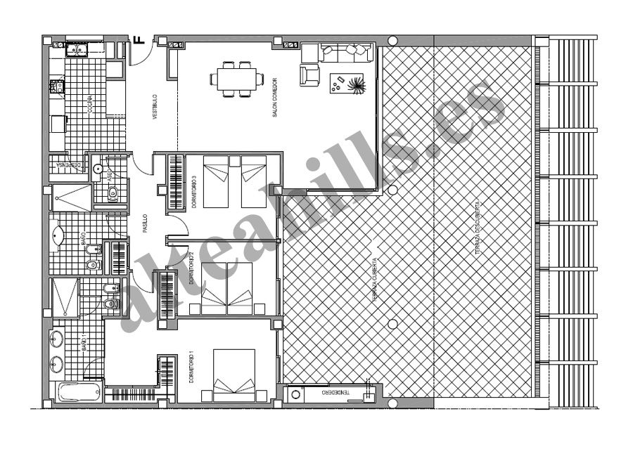 El ático cuenta con tres amplios dormitorios y dos baños completos, además